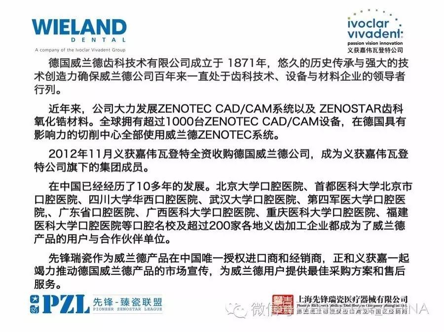 透過德國(guó)威蘭德一百多年的發(fā)展歷史,從諾貝爾化學(xué)獎(jiǎng)到口腔金沉積技術(shù)的研發(fā)和應(yīng)用,德國(guó)威蘭德的每一步始終走在了口腔技工行業(yè)的最前端。擁有最先進(jìn)的氧化鋯生產(chǎn)工藝及氧化鋯圓盤的行業(yè)專利標(biāo)準(zhǔn)和獨(dú)有的染色工藝,使德國(guó)威蘭德必定成為口腔義齒加工技術(shù)的主導(dǎo)者和締造者。